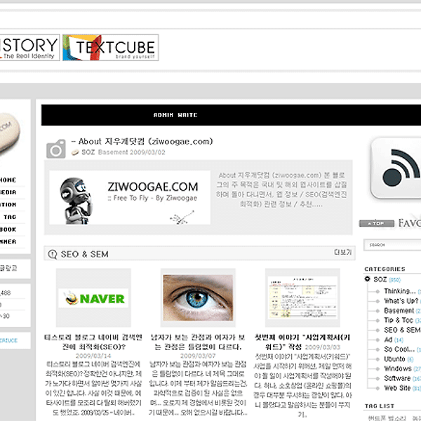 Criuce Black 티스토리용으로 수정완료. 얼마전 어떤분께서 현재 제가 사용하고 있는 스킨(Criuce Black)을 티스토리용으로 바꿔서 줄 수 있느냐고 저한테 물어보시더군요... 현재 제가 사용하고 있는 스킨인(Criuce Black)... 이제 테스트를 조금더 하고 크리어스님 한테 여쭤 보는 일만 남았군요... 확인하실 분들은 http://zdesign.tistory.com/ 하시면 될꺼 같습니다. 덧) 크리스어스님 블로그 메인만 접속이 되고 오류를 뿜내요 ㅠㅠ*
