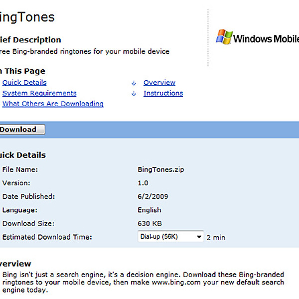 MS Bing 이젠 핸드폰 벨소리도~ BingTones MS 검색엔진인 Bing 핸드폰 벨소리도 공개 했습니다. 다운로드 받으면, PDF파일과 3종류의 MP3 파일이 있습니다. BingTone 1 BingTone 2 BingTone 3 BingTones Bing isn't just a search engine, it's a decision engine. Download these Bing-branded ringtones to your mobile device, then make www.bing.com your new default search engine today. http://www.microsoft.com/downloads/details.aspx?displaylang=en&FamilyID=043c4..